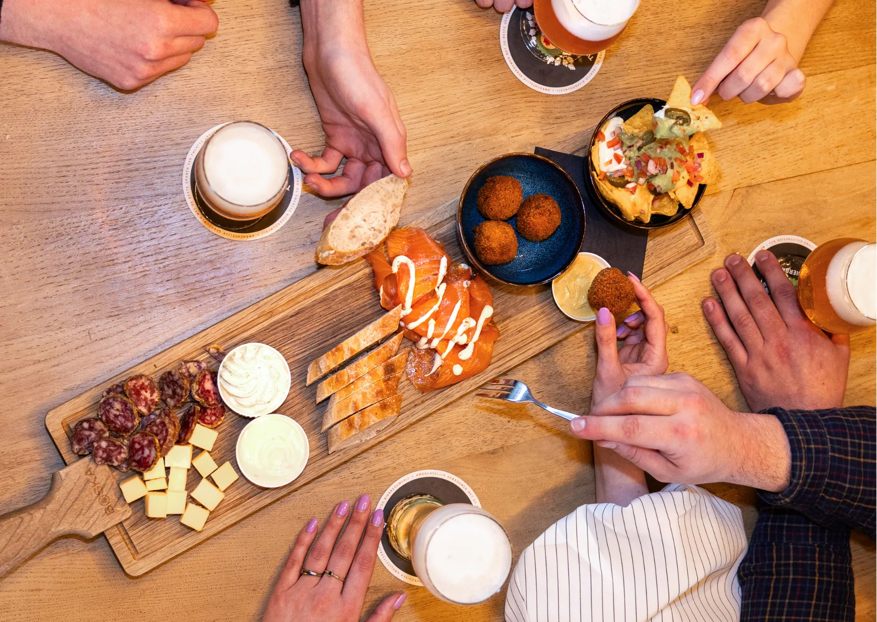Jonge kaas, Twentse droge worst,gerookte zalm, bitterballen, nacho's,brood, kruidenboter en knoflooksaus