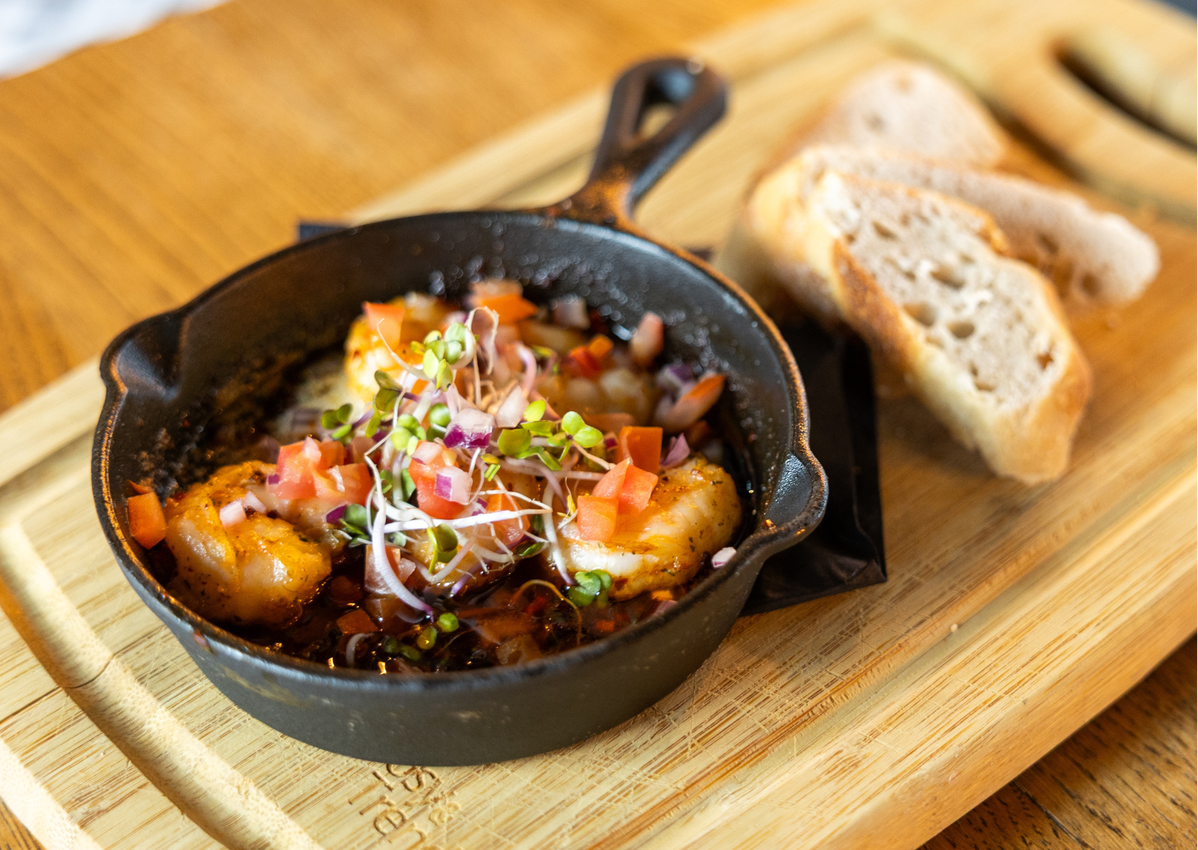 - Sizzling gamba's gegratineerd in crispy chili olie en kruidenboter, met Twents bierbostelbrood