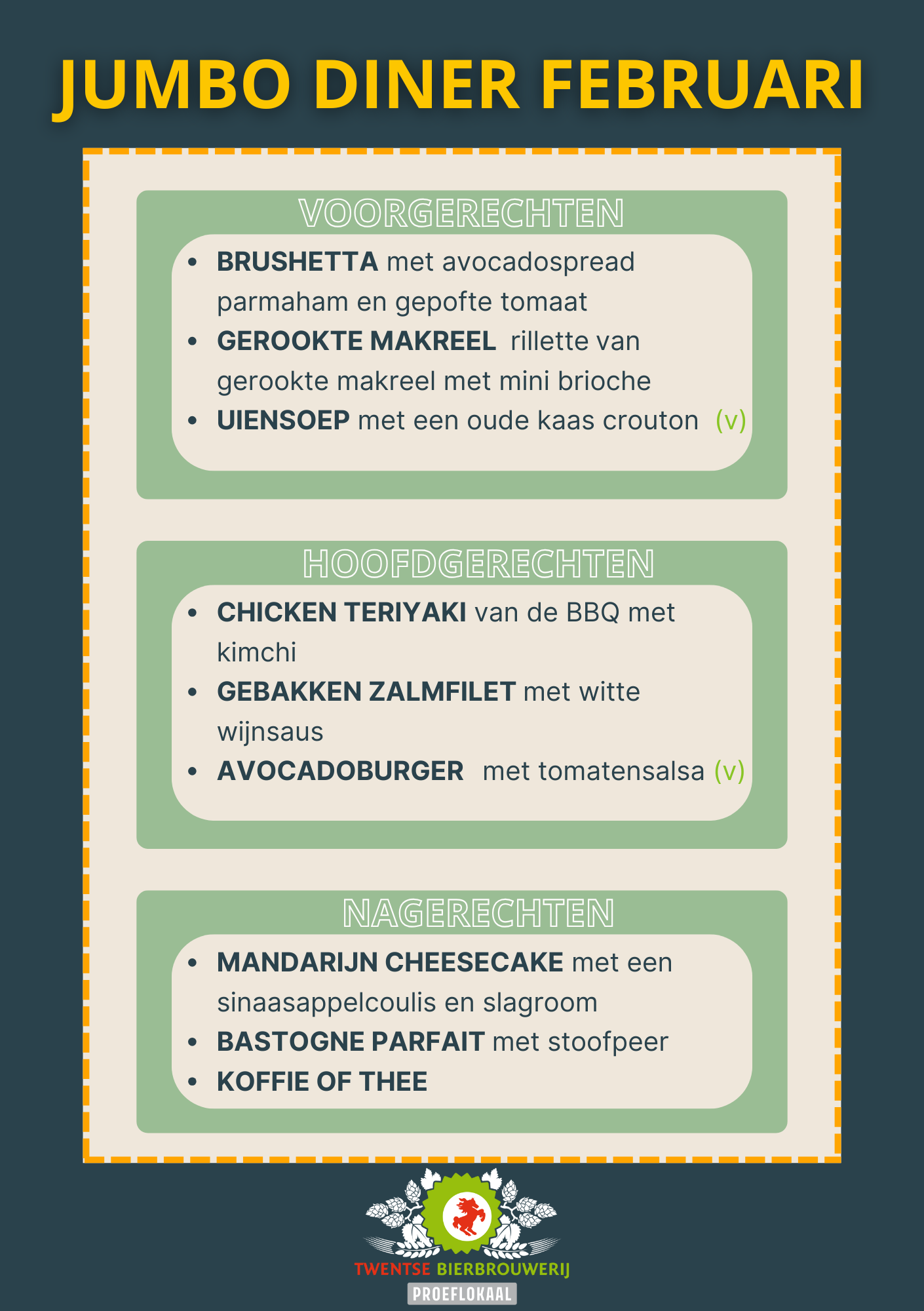 Spaar bij de deelnemende Jumbo’s voor een volle spaarkaart en geniet van een heerlijk diner voor 2 voor slechts €49,00. Het Jumbo Diner vindt plaats in de maanden januari en februari, waarbij elk van deze maanden een ander speciaal menu biedt. Zo kun je twee keer genieten van een unieke culinaire ervaring!